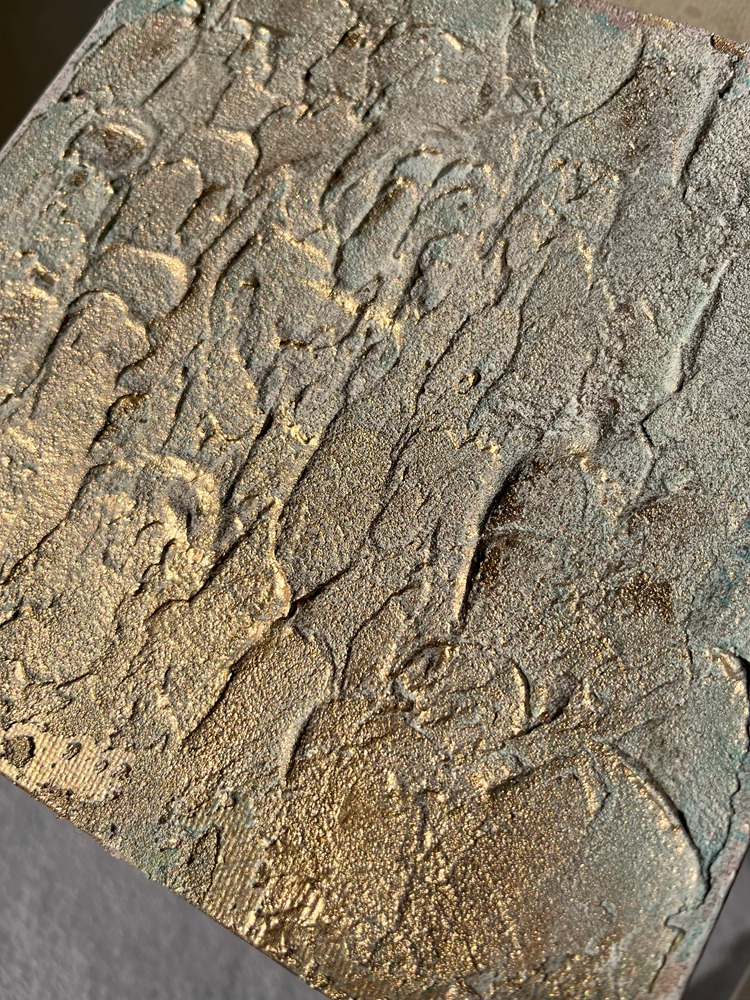 ちなみに、凹凸のある画面に絵の具を重ねスプレーで撫ぜるように〈金〉を着色したので