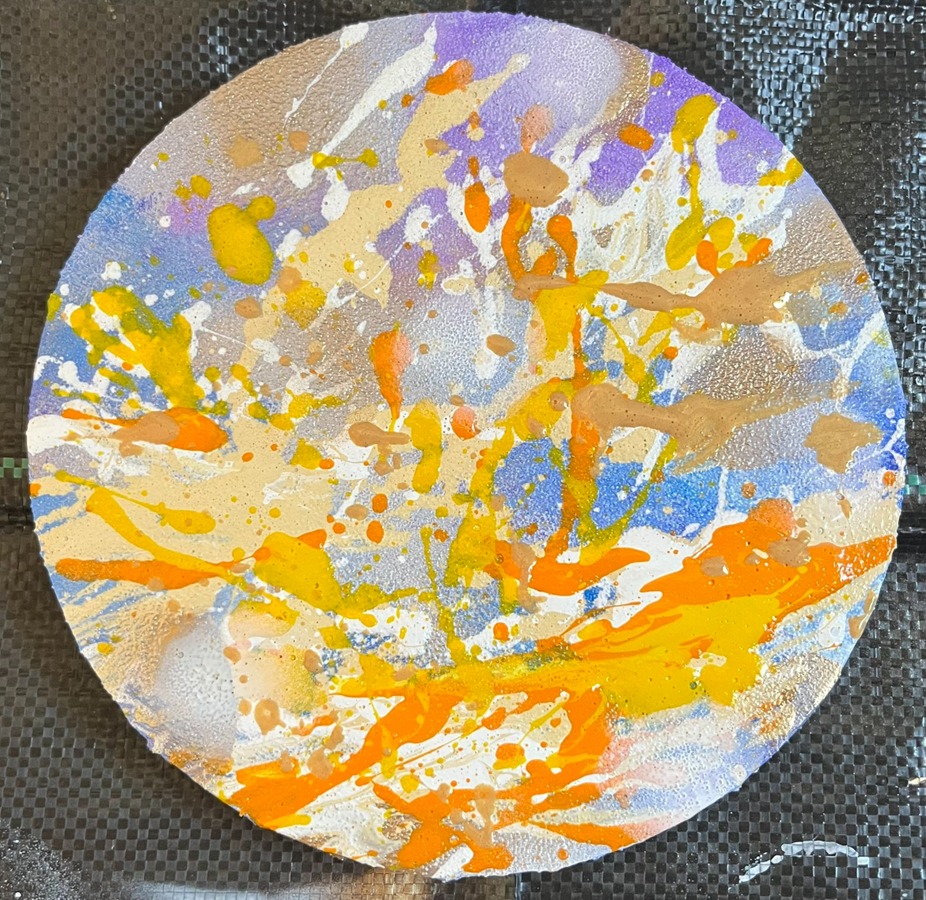 参加作品制作風景:アクリル絵具で作ったテクスチャーの上に色違い・大きさが違うレジンを並べて
