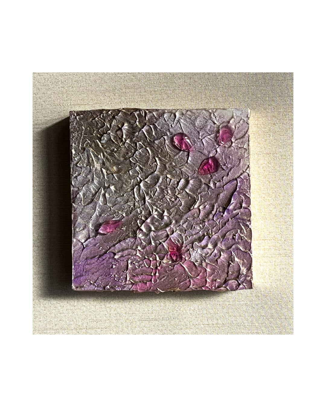 ①テクスチャーアートとは、絵の具とメデュームを使って絵肌や質感、凹凸を表現した絵画です。ほこりなど取る場合は柔らかい布で優しくふき取ってください。