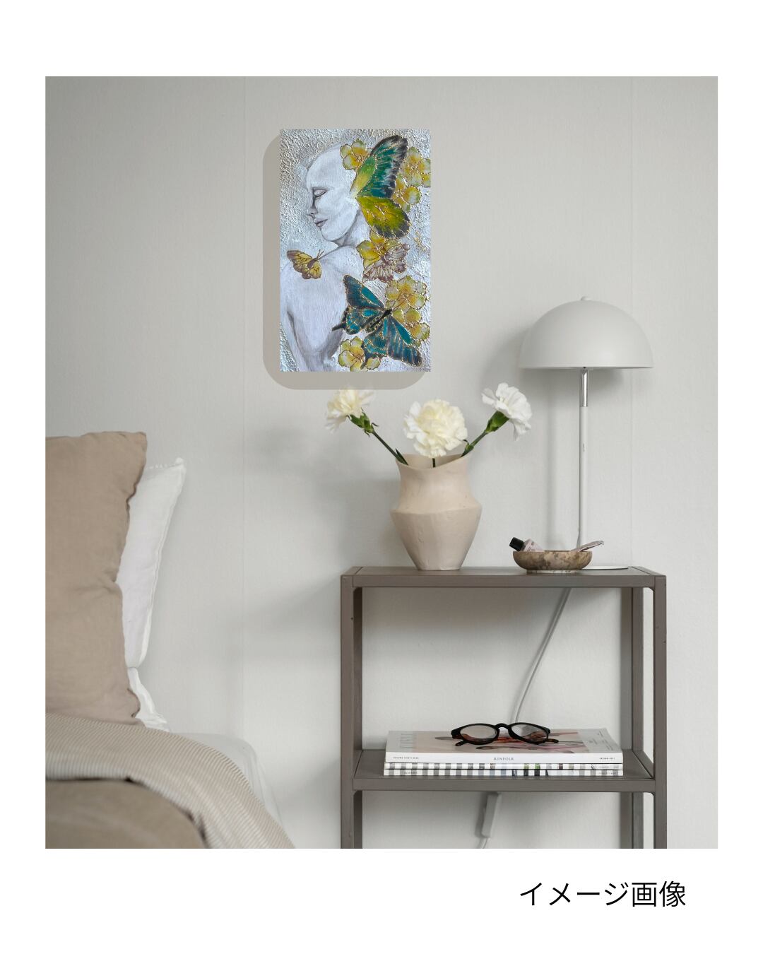 〈囚われた思いから自由に羽ばたいて欲しい〉という思いで〈羽ばたく蝶〉とやすらぎの色を使って制作しました。