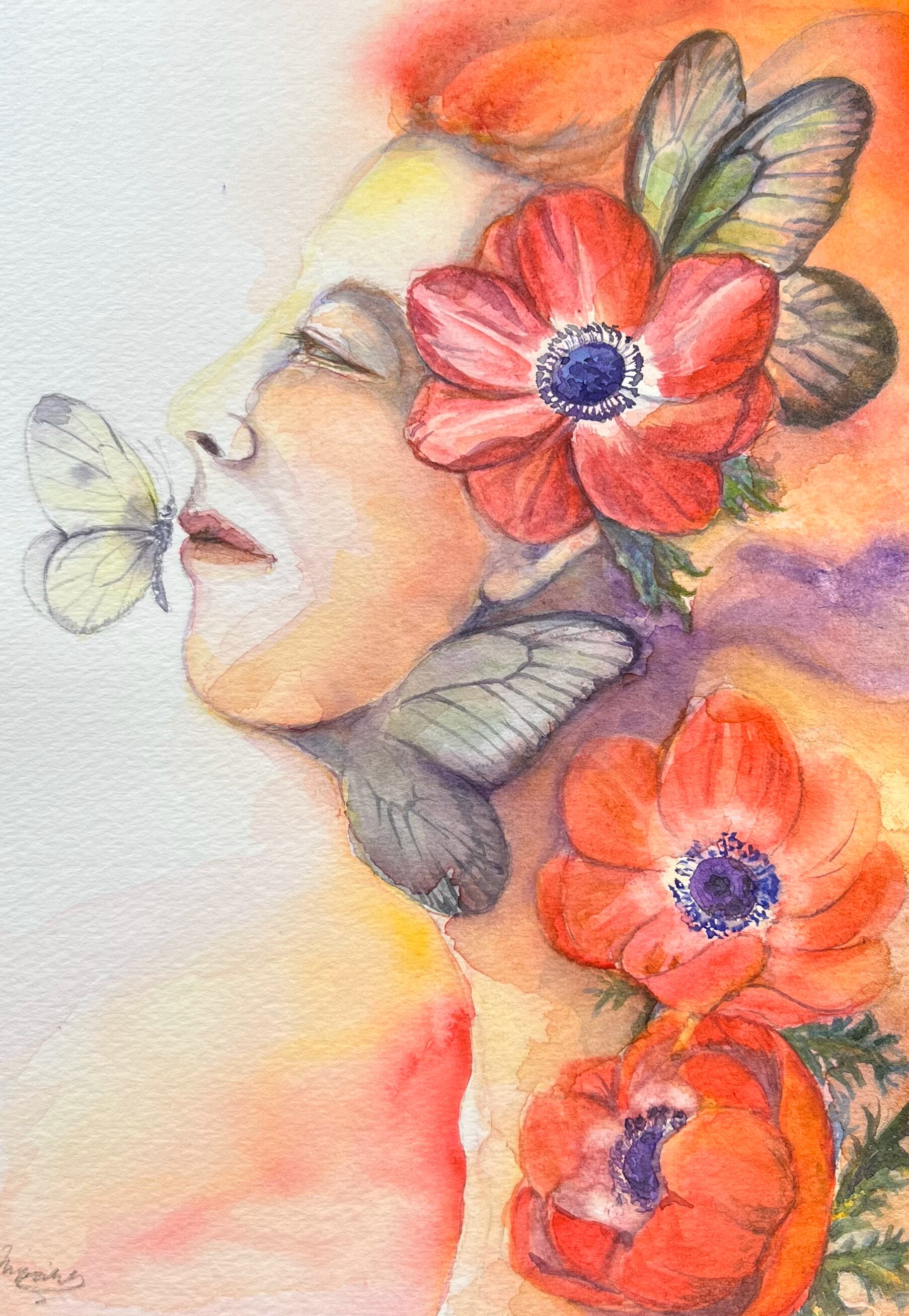 長く満たされない思いを抱えていた作家が〈愛〉に気が付いた瞬間を唇に触れる蝶で表現しました。