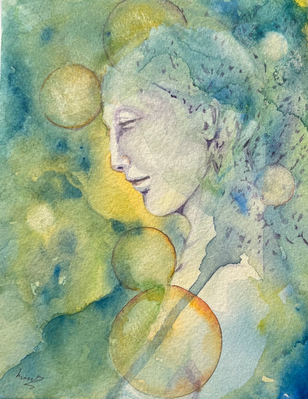 若葉色は「再生」「リスタート」緑は「自然体」黄色は「楽しさ」と、今まで感じた事のない心の温かさと平穏さを感じた穏やかな表情を描きました。