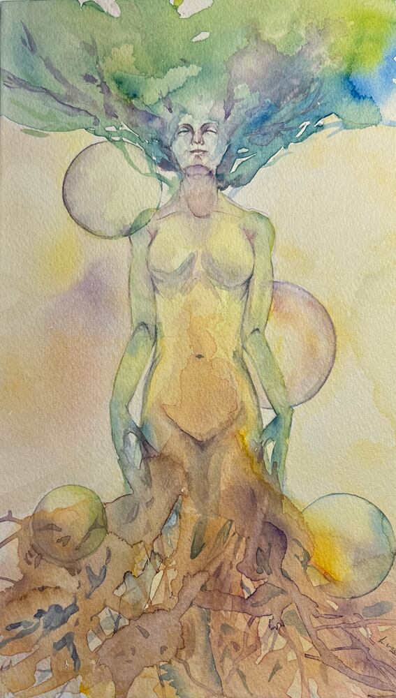 ペン画は亀裂の入った悲しい表情だった印象が〈色彩〉を得て表情豊かに変化。「自分の心と向き合う勇気が生き方を変える」そんなメッセージを込めた作品です。